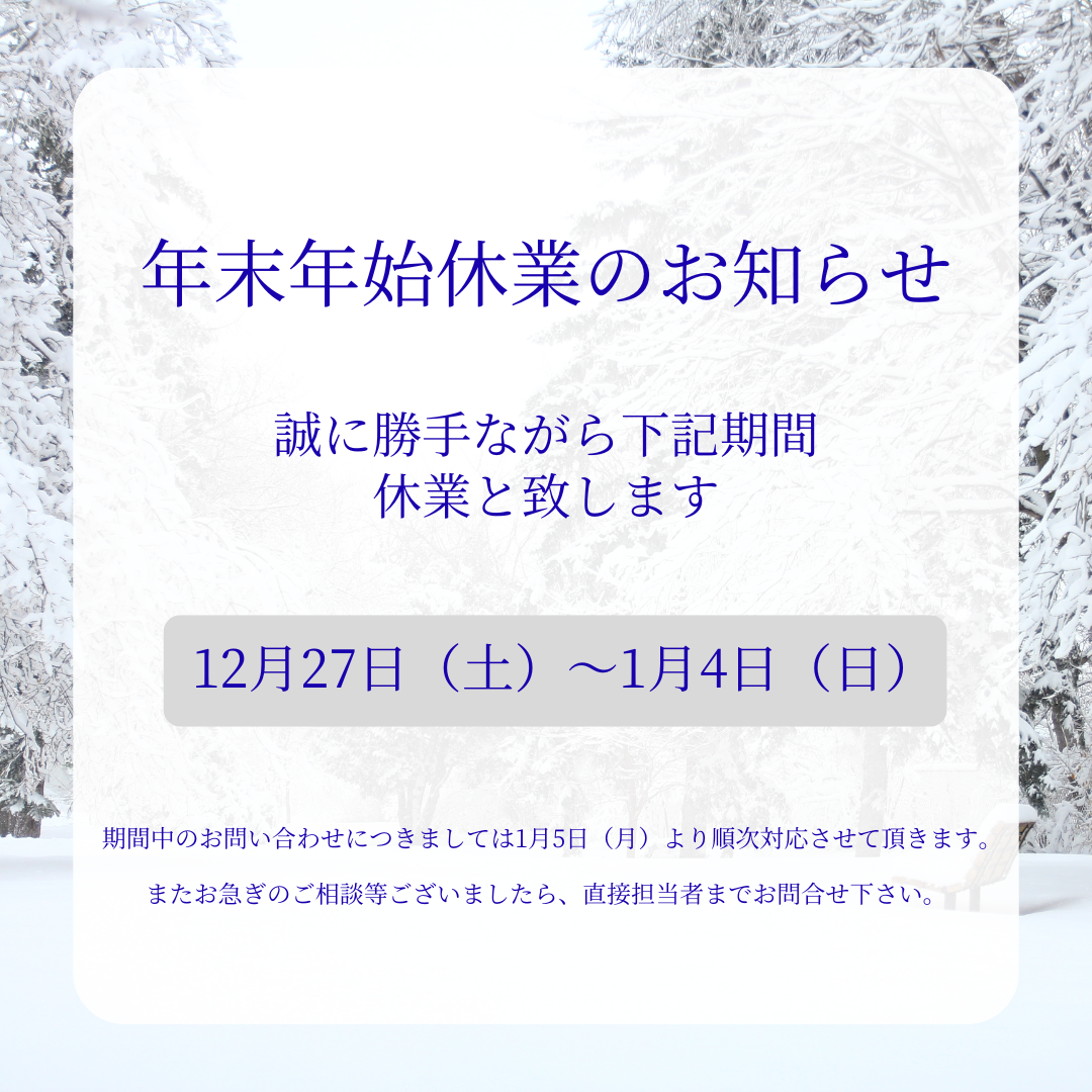 Posted on 2025年12月19日 by totalreform年末年始休業のお知らせ 株式会社トータルリフォームでは年末年始休業のため下記日程を休業させていただきます。 ご迷惑をお掛けいたしますが、何卒ご了承いただきますようお願い申し上げます。 年末年始休業期間:2025年12月27日(土)から2026年1月4日(日)まで